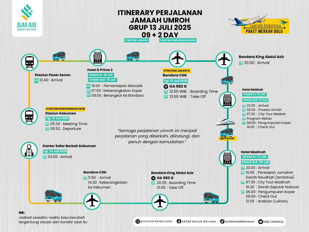 - Jadwal, Harga, Akomodasi dapat berubah sewaktu-waktu mengikuti fluktuasi dollar, kebijakan maskapai dan Pemerintah Saudi / Indonesia